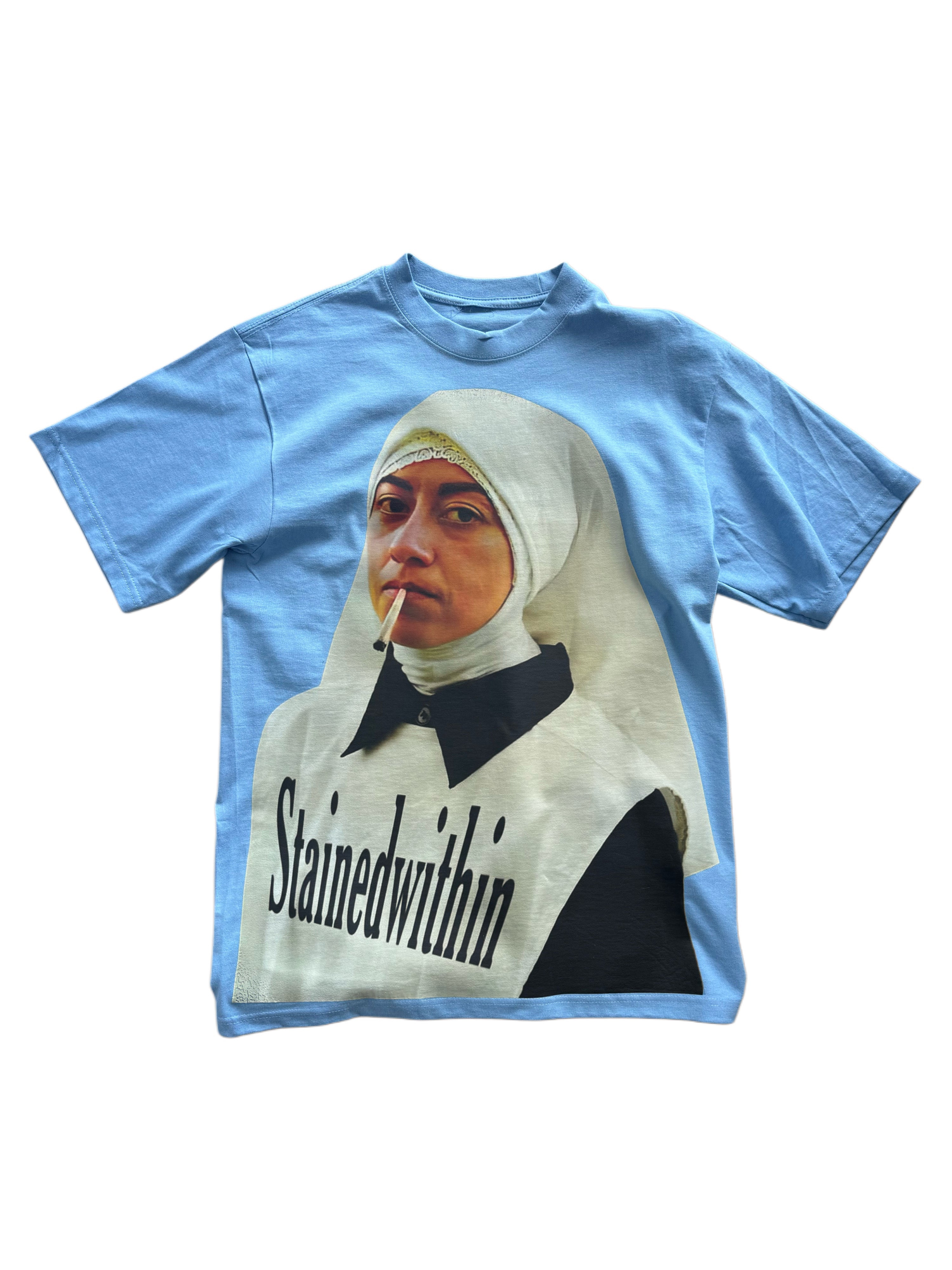 Turn heads with one of our boldest statement pieces. The Stainedwithin “Nun With a Cig” Tee features a striking full-front graphic of a stoic nun calmly smoking, blending irreverent street culture with high-contrast art. Printed on a soft sky-blue heavyweight cotton tee, this piece delivers both comfort and attitude.